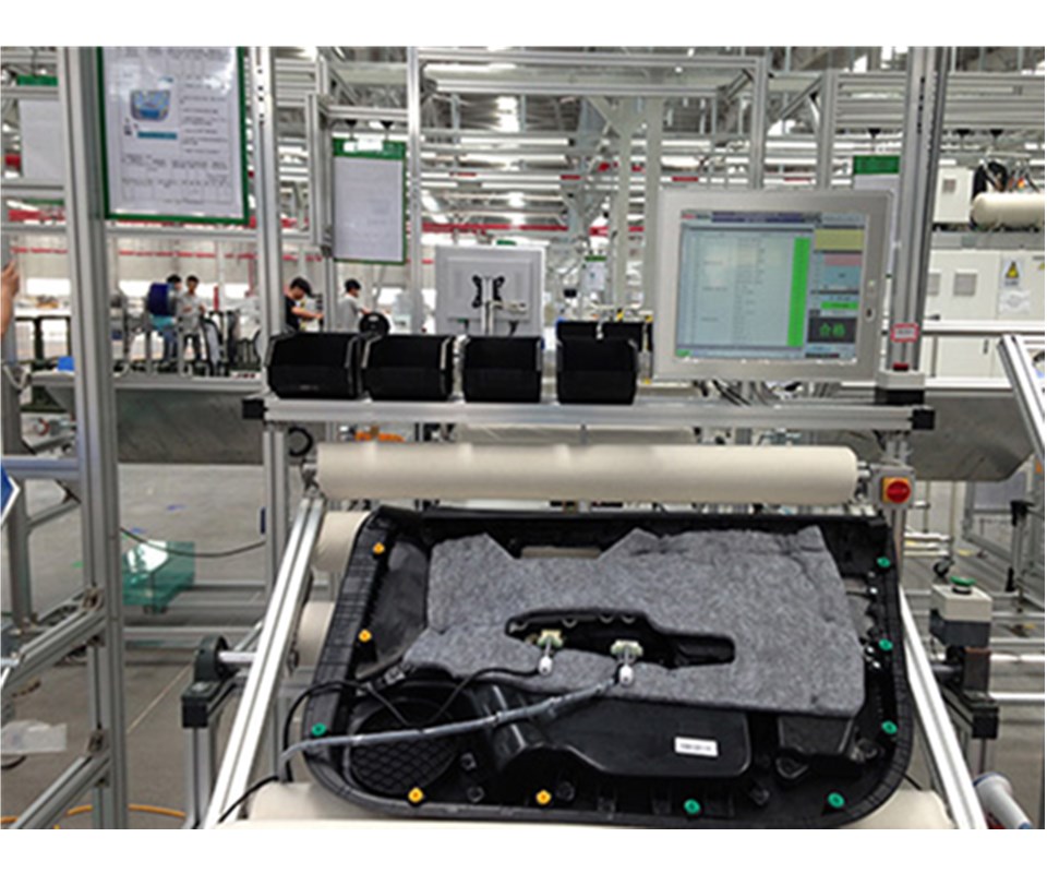 從上一個工位取一個門板,放到測試架上,掃描門板上的條碼,然后,放對應(yīng)安裝組件的框前指示燈會亮。接著操作員從對應(yīng)的框中取出相應(yīng)的組件,通過掃描組件上的條碼來確認組件是否正確(在進行規(guī)格設(shè)定的時候,都已經(jīng)將每個門板上對應(yīng)組件的條碼輸入進去了),在掃描組件條碼確認OK后,對應(yīng)的框前指示燈會熄滅。然后操作員將組件安裝到門板的指定位置,接上測試連接線。接著操作員按照固定的順序?qū)﹂T板的開關(guān)按鍵進行一一測試。測試完成后所有數(shù)據(jù)會存儲。