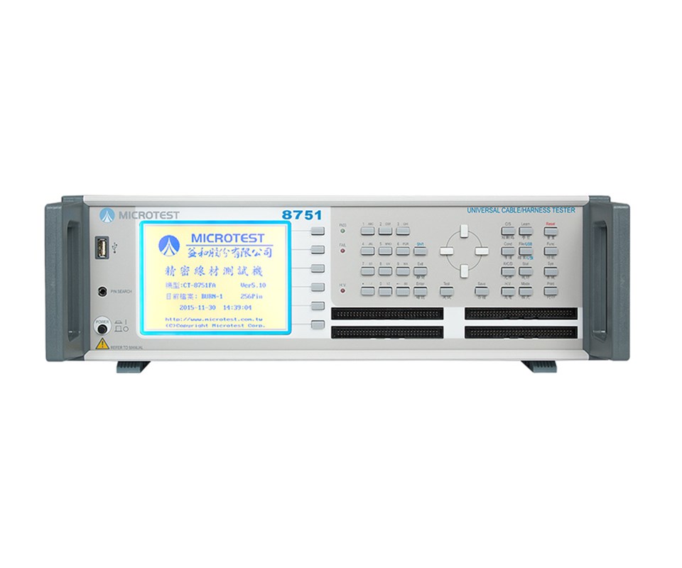 測(cè)試線材的項(xiàng)目包含: 導(dǎo)通阻抗、瞬間導(dǎo)通、元件測(cè)試 ( 電阻、電容、二極體 )、安規(guī)測(cè)試 (AC 高壓 / 漏電流、DC 高壓 / 漏電流 、絕緣阻抗 )、和短斷路、瞬間斷短路、快速瞬間斷路、短斷路端點(diǎn)判斷及單邊測(cè)試。支援RS-232, USB Host, Print, Remote等介面。